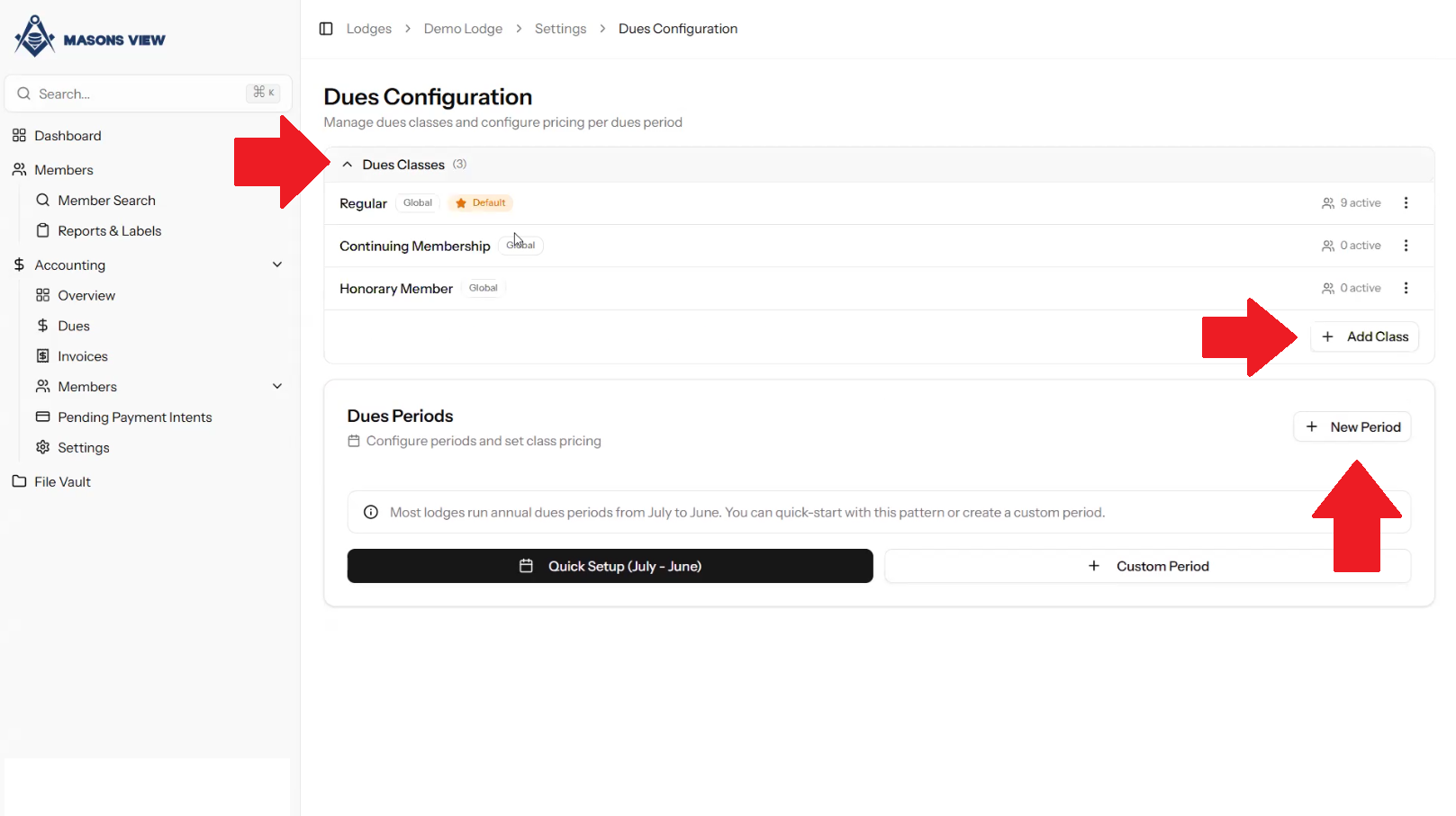 Clicking on the arrow next to DUES CLASSES will drop down the existing dues options. You can ADD CLASS by clicking the appropriate button for setting a discounted rate as an example. Selecting NEW PERIOD will pop out the CREATE DUES PERIOD box where you select the name, start and end dates of the period, and the payment due date. Once you have entered your information, select CREATE PERIOD to continue.