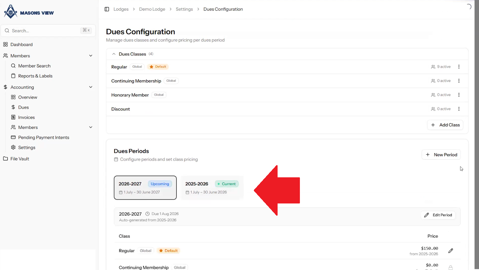 Where multiple DUES PERIODS exist you can toggle between them by selecting the appropriate period. Within each period you can set differing prices to reflect the current period.