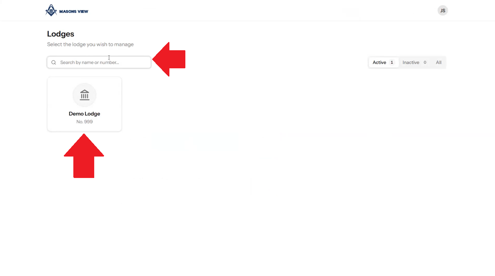 Search for your lodge using the search bar or select your lodge using the buttons on screen.