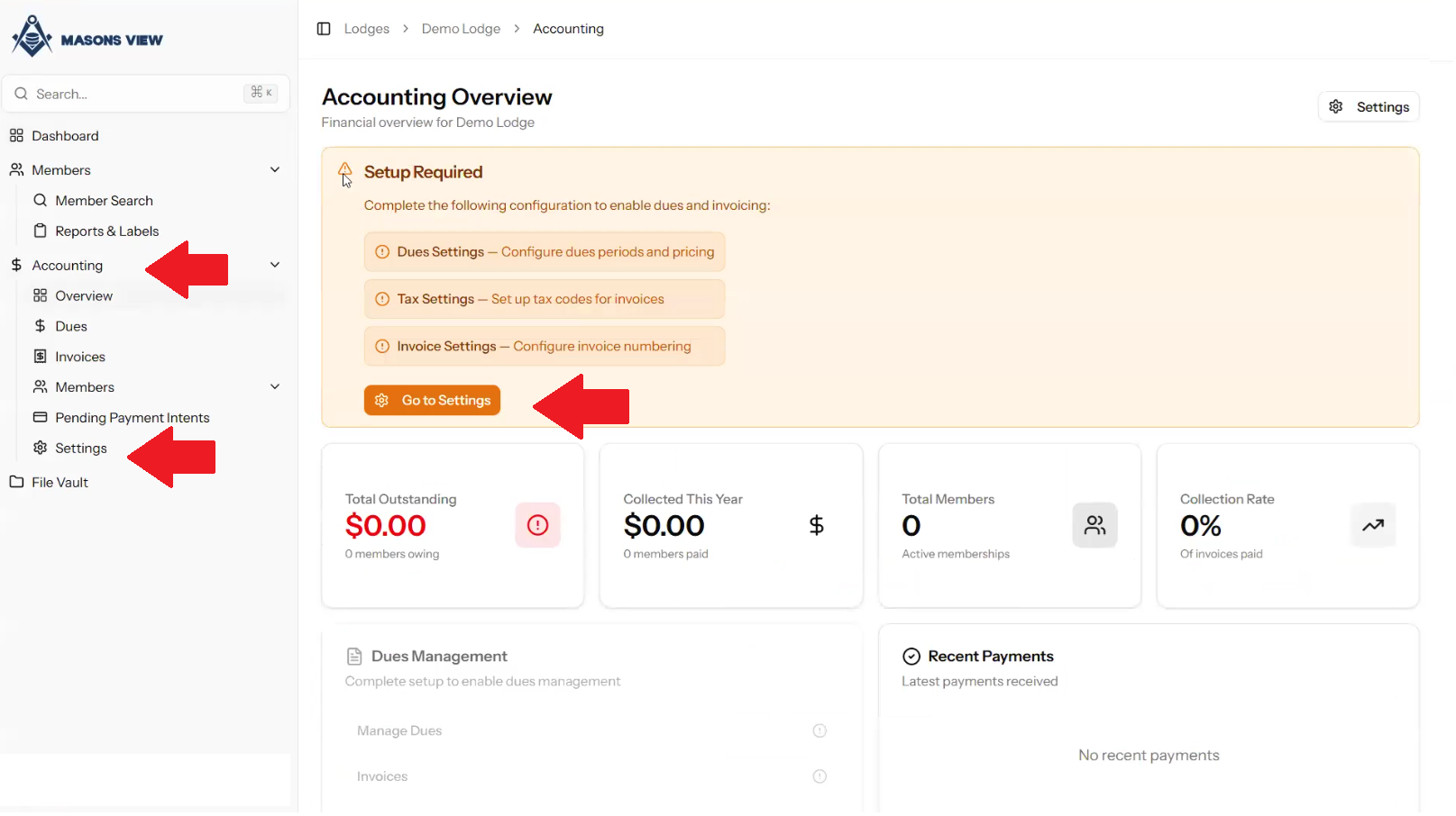 Select ACCOUNTING from the left hand menu to load the accounting dashboard, followed by selecting SETTINGS from either the dashboard itself, or the left hand menu as indicated in the screen grab below.