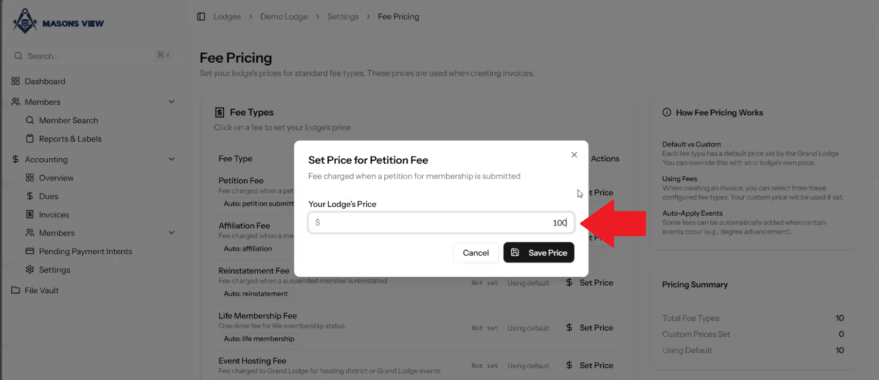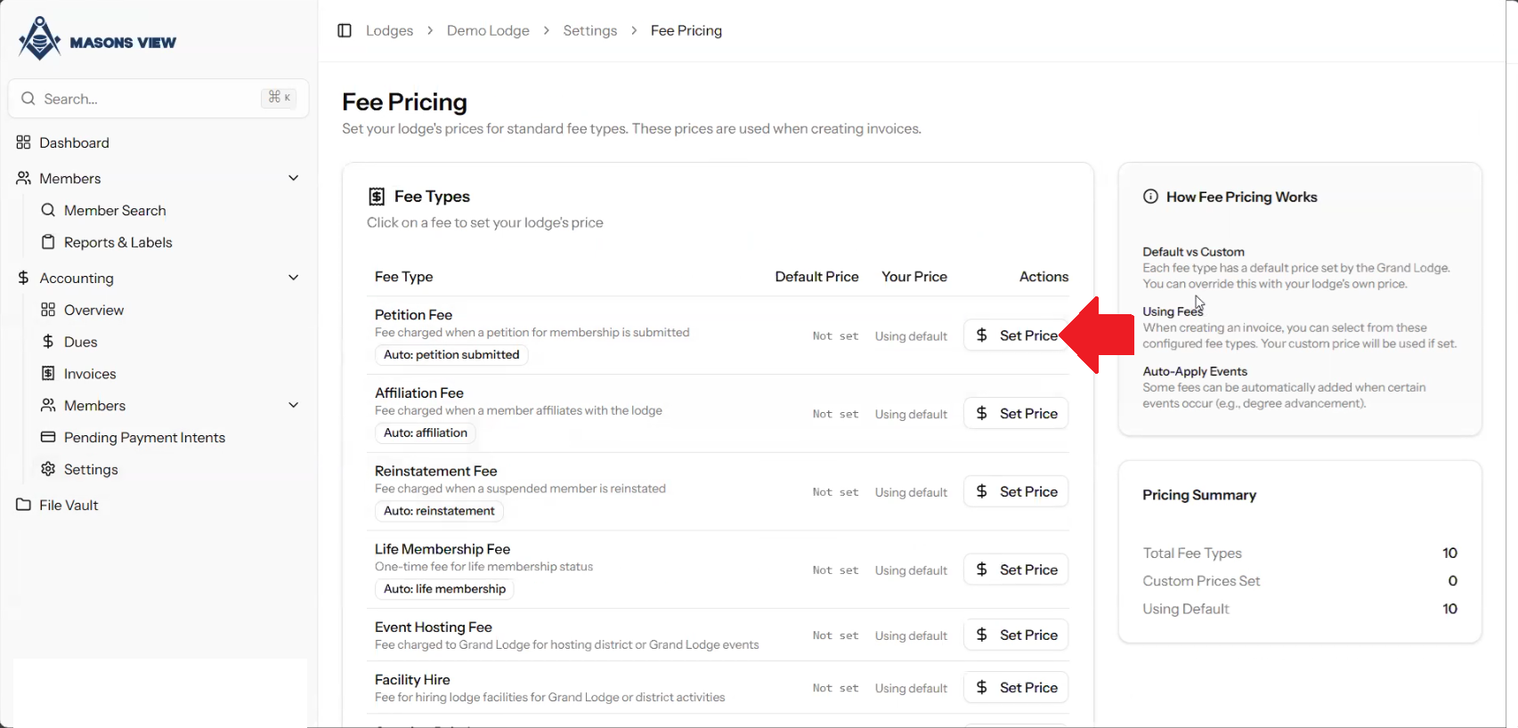 Once the FEE PRICING screen loads, as shown below, you are able to set pricing for specific types of fees on a Lodge by Lodge basis. The DEFAULT PRICE is what is set at Grand Lodge level. If you select a line item and click the SET PRICE button next to it, you can edit the price for the Lodge you are logged in as.