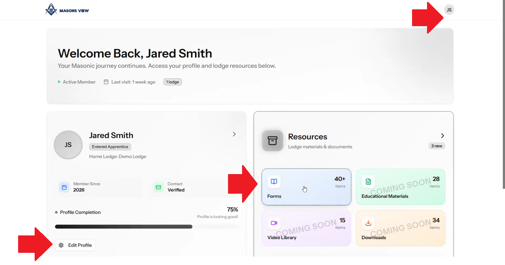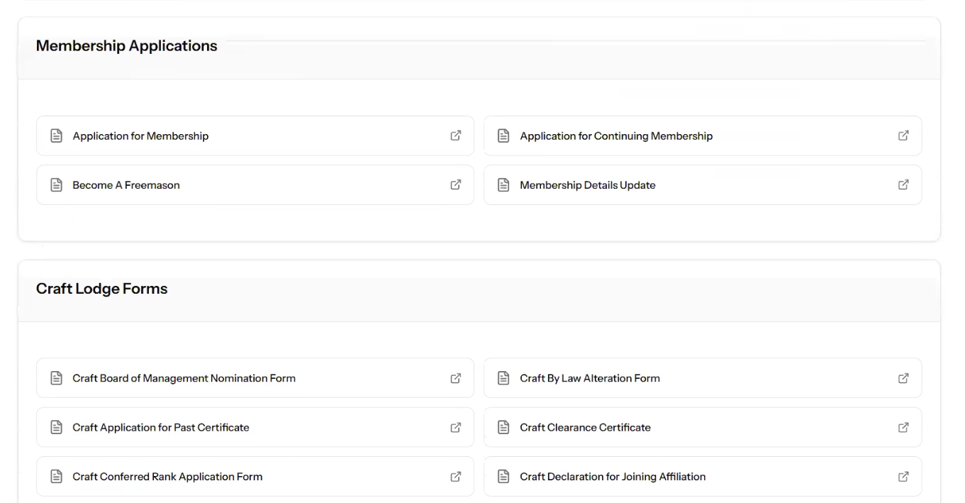 Selecting the FORMS button under RESOURCES will load up documents and links you can access that may be required for your role as a Freemason.