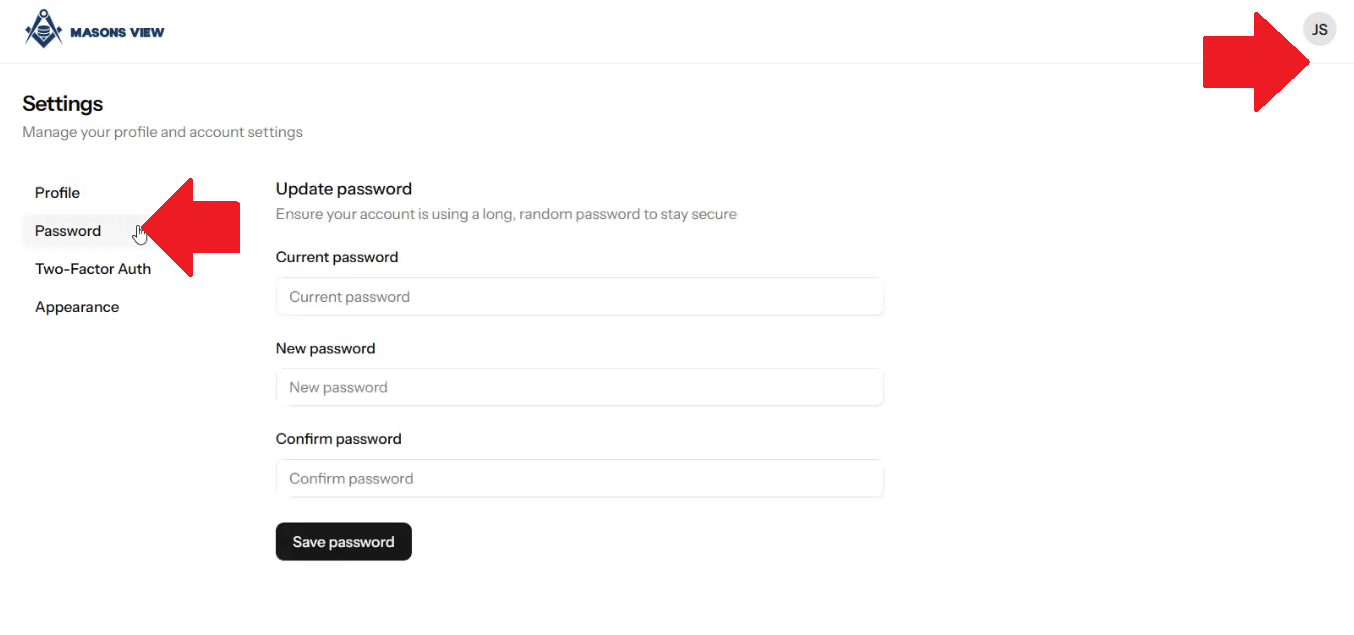Selecting your initials in the top right of screen will load your profile options where you can change your password amongst other options.