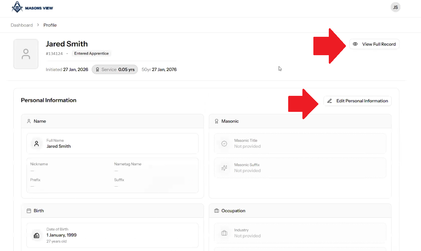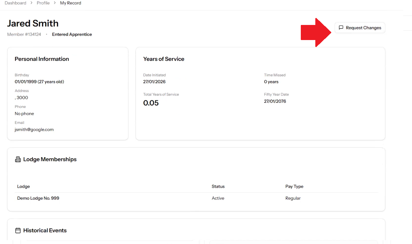 If you select VIEW FULL RECORD you will see your Masonic Record, including roles and key dates. If you need any amendments made, you can click REQUEST CHANGES which will trigger a ticket to Grand Lodge administration to review your comments and adjust accordingly.